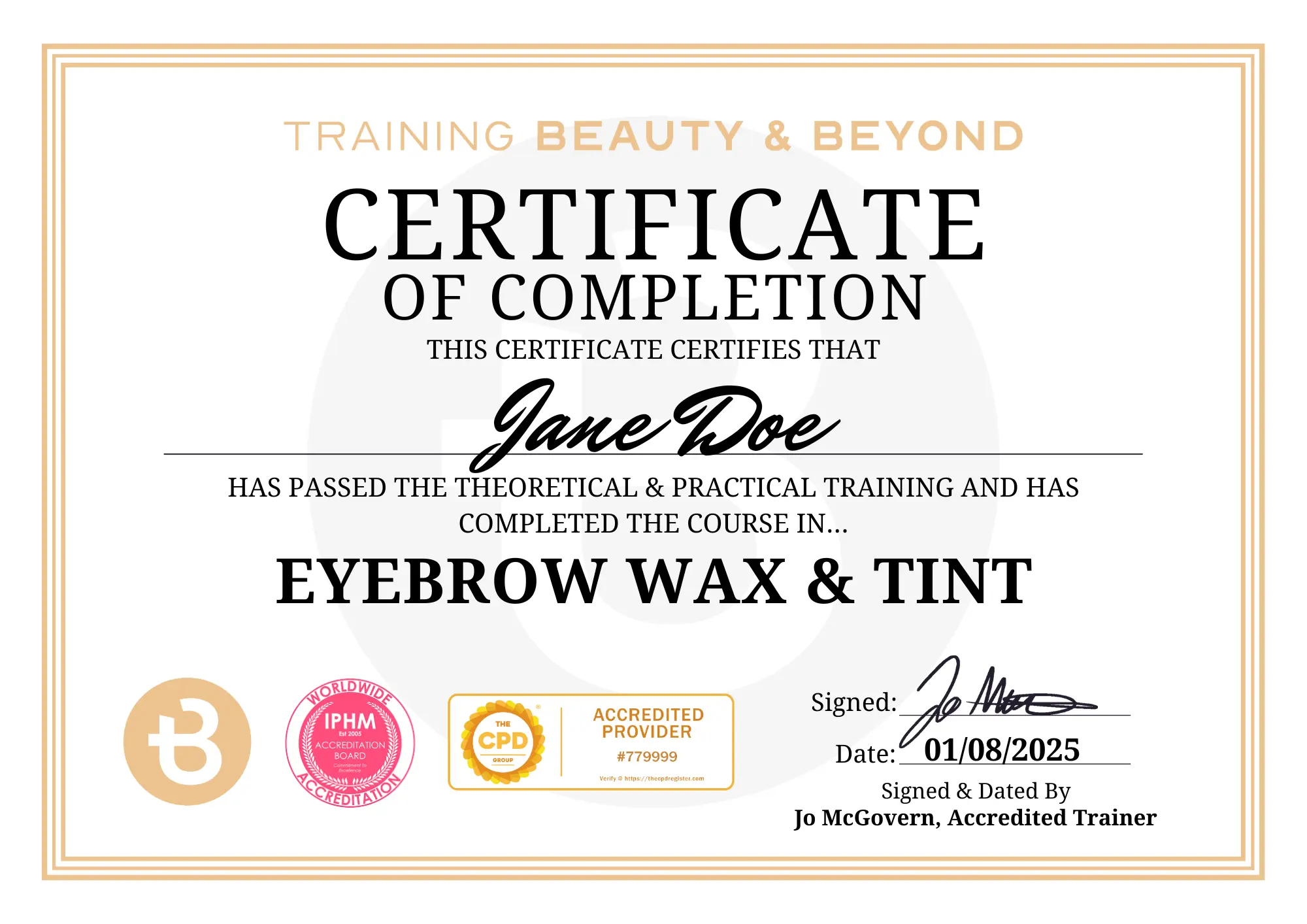 You’ll earn an accredited certification through IPHM Beauty and The CPD Group in Eyebrow Wax & Tint once all graded assignments are successfully completed.