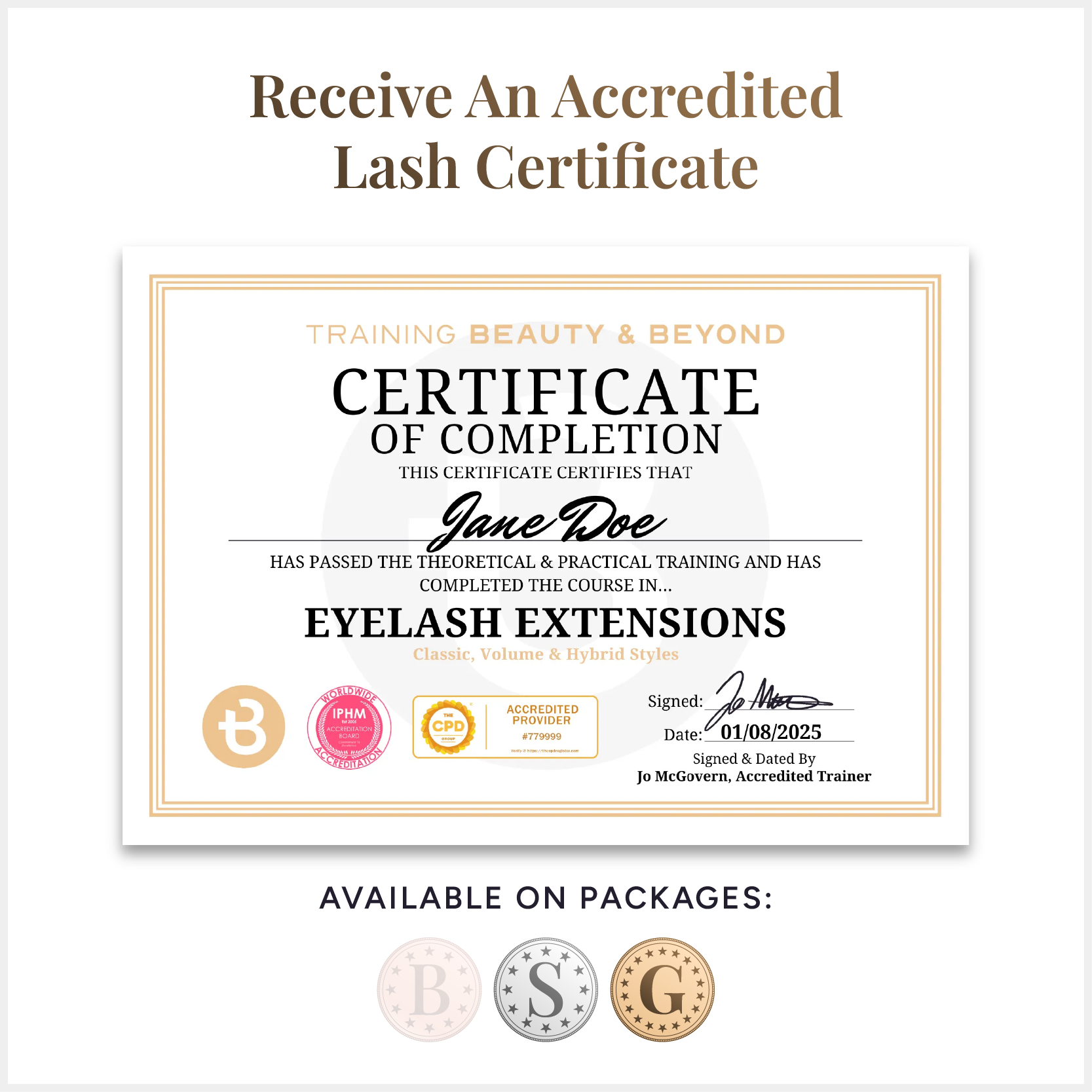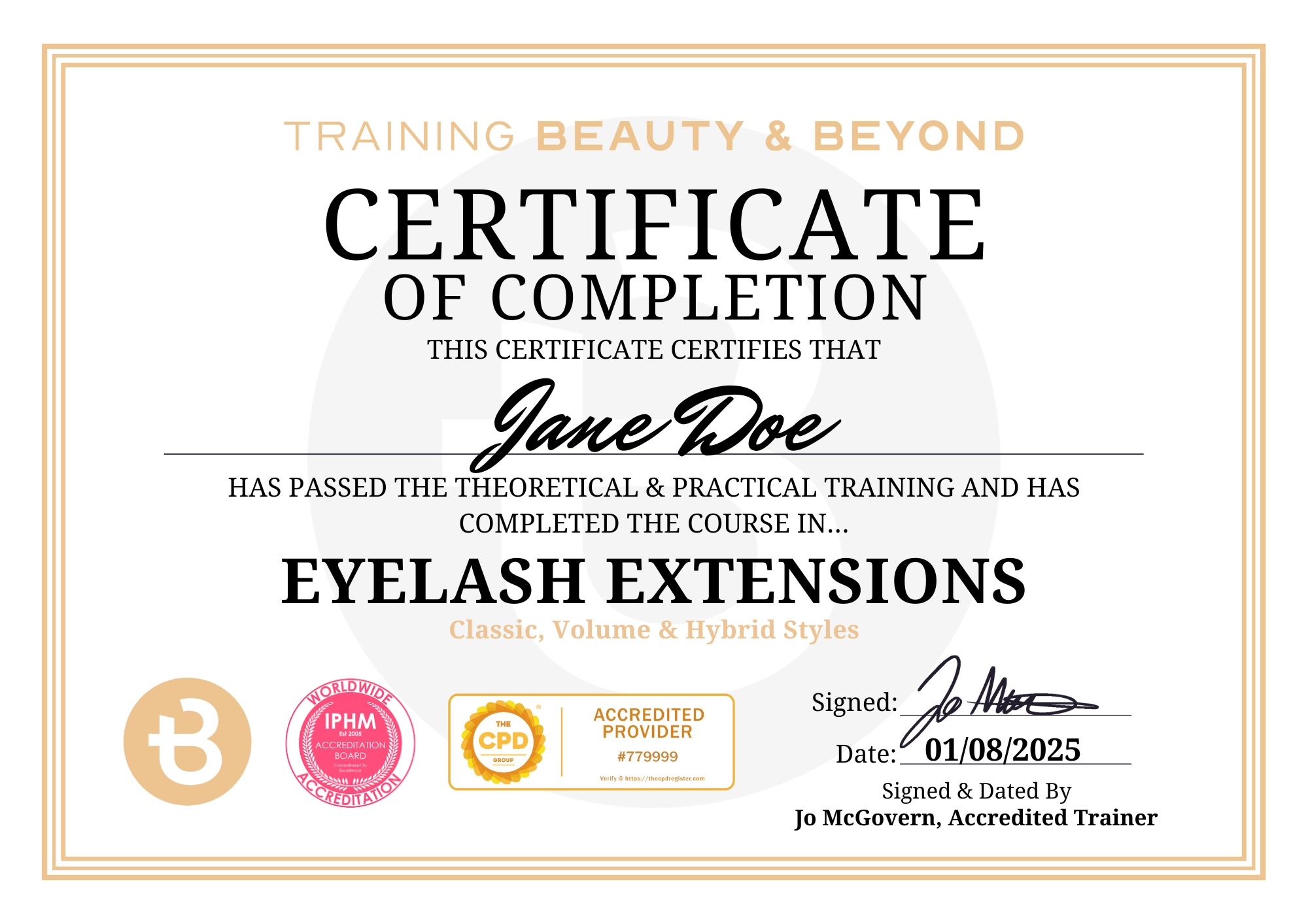 You’ll earn an accredited certification through IPHM Beauty and The CPD Group in Classic, Volume, Mega-Volume, and Hybrid eyelash extension techniques once all graded assignments are successfully completed.
