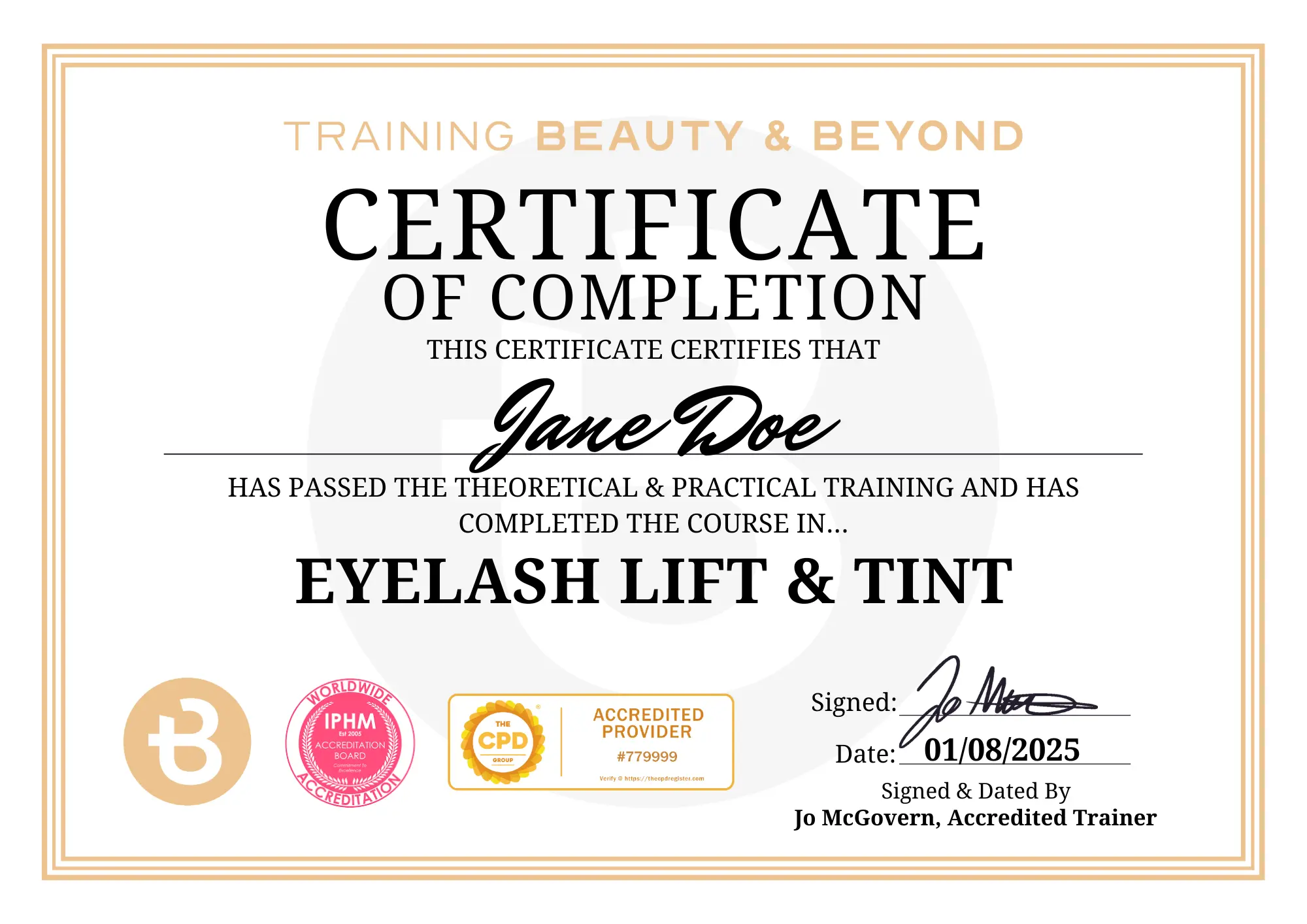 You’ll earn an accredited certification through IPHM Beauty and The CPD Group in Eyelash Lift & Tint once all graded assignments are successfully completed.